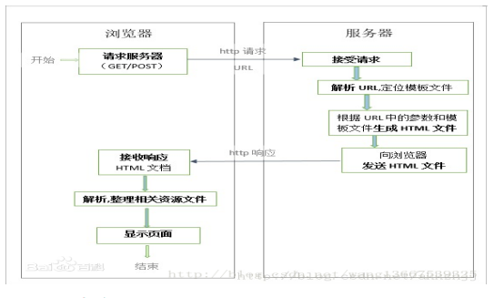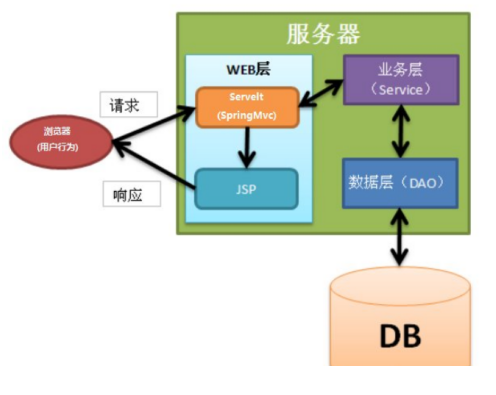 页面发送请求给控制器,控制器调用业务层处理逻辑,逻辑层向持久层发送请求,持久层与数据库交互,后将结果返回给业务层,业务层将处理逻辑发送给控制器,控制器再调用视图展现数据。