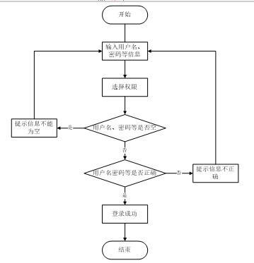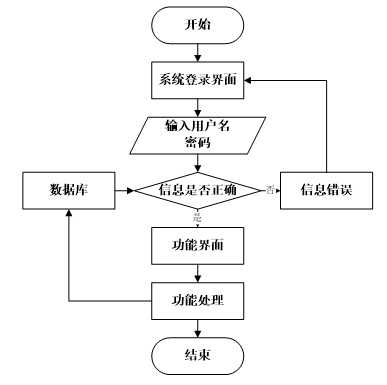 用户打开并进入系统后,会先显示登录界面,输入正确的用户名和密码,系统自动检测信息,若信息无误,则用户会进入系统功能界面,进行操作,否则会提示错误无法登录,操作流程如图3-3所示。