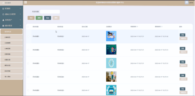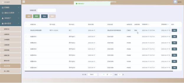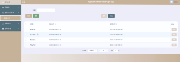 (2)通知公告:管理员点击“通知公告”菜单可以查看到系统中的所有通知公告信息,对已经存在的通知公告,管理员可以修改,也可以添加新的通知公告或者删除通知公告。