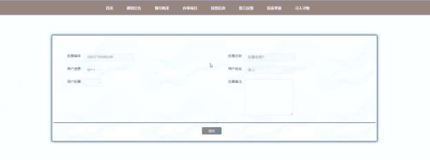 (5)投票:当用户在投票信息详情界面想要进行投票,点击下方的“投票”按钮,就会跳转到投票信息填写界面,根据界面提示输入投票信息,点击“提交”按钮,投票就完成了;