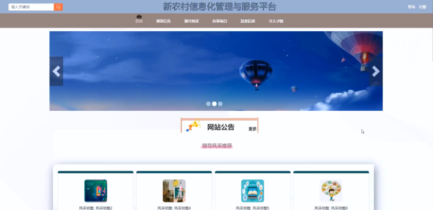 (2)查看新农村信息化管理与服务平台的首页信息:新农村信息化管理与服务平台的首页信息包含了通知公告、领导风采、办事项目、投票信息、留言反馈、投诉举报、寻人寻物、我的(我的账户、我的收藏、个人中心)。