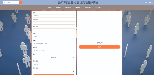 本设计主要实现集人性化、高效率、便捷等优点于一身的新农村信息化管理与服务平台,完成系统用户管理、领导风采、办事项目、分类管理、办事进度、投票信息、投票记录、留言反馈、投诉举报、寻人寻物等功能模块。系统通过浏览器与服务器进行通信,实现数据的交互与变更。本系统通过科学的管理方式、便捷的服务提高了工作效率,减少了数据存储上的错误和遗漏。新农村信息化管理与服务平台使用Java语言,采用基于 MVVM模式的springboot技术进行开发,使用 Eclipse 2017 CI 10 编译器编写,数据方面主要采用的是微软的MySQL数据库来作为数据存储媒介,配合前台HTML+CSS 技术完成系统的开发。