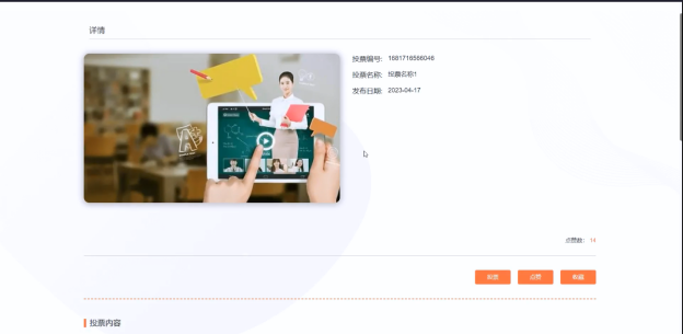 (4)投票信息:当用户点击“投票信息”这一菜单按钮,会显示管理员在后台发布的所有的投票信息,支持通过关键词对投票信息进行搜索,选择需要的投票信息点击可以进入到投票信息详细的介绍界面,在详细界面可以查看到投票的投票编号、投票名称、发布日期等信息,同时可以进行投票、点赞、收藏、评论操作;