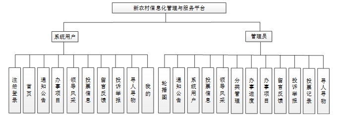 新农村信息化管理与服务平台我划分为了管理员模块以及系统用户模块这两大部分。