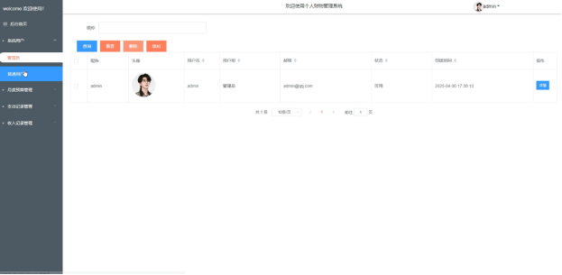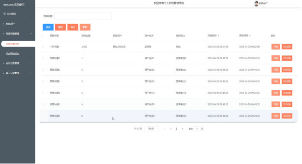 Regular users can log in to the system via registration to perform operations such as maintaining personal information, managing monthly budgets, querying expenditure records, and adding income entries; the homepage of the backend provides intuitive statistical charts to help users quickly understand their financial status, and supports clicking on the avatar to change passwords and personal information. For administrators, in addition to all the functions available to regular users, they can also manage user accounts, add, delete, and export budget and income records, ensuring data security and management flexibility. Through this system, users can not only plan their personal finances more scientifically but also improve the accuracy and efficiency of financial management, adapting to the fast-paced lifestyle of modern society.