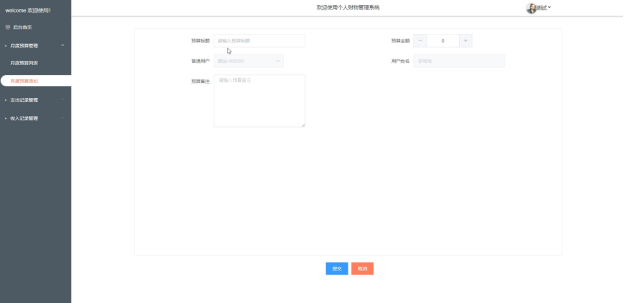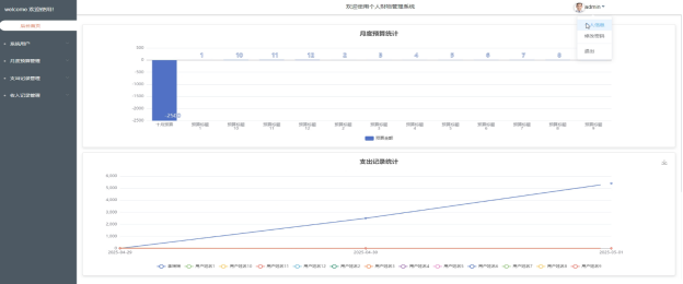 - 后台首页:在后台首页,管理员会看到一个功能导航栏,方便快速访问不同的管理模块。首页还展示了月度预算统计图,帮助管理员直观了解当前的预算使用情况。还有支出记录统计图和收入记录统计图,这些图表为管理员提供了详细的财务流动信息。在页面的右上角,有一个头像图标,点击后可以查看和修改个人信息,或者更改密码,确保账户安全。