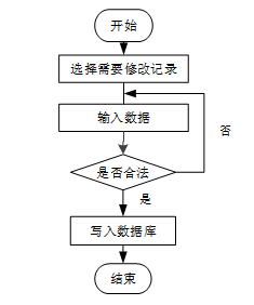用户首先选择需要修改的记录,输入修改后的数据,系统判断输入数据是否合法。若数据不合法,提示重新输入,若数据合法,则将修改后的数据写入数据库,完成操作后流程结束。修改信息流程图如下图所示。