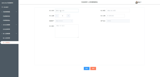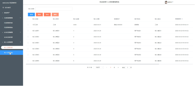 - 收入记录管理:在收入记录管理模块,管理员可以添加新的收入记录,也可以对已有的记录进行删除或查询操作。点击任何一个收入记录,可以查看其详细信息,包括收入的来源、金额和日期。此外,管理员还可以将收入记录导出,以便进行财务汇总或报告。