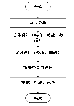 系统开发流程的主要步骤,从需求分析到系统完成的全过程。流程包括需求分析、总体设计(结构、功能、数据)、详细设计(模块、编码)、模块整合与调用,以及测试、扩展和完善,最终完成系统的开发。本系统的开发流程如下图所示