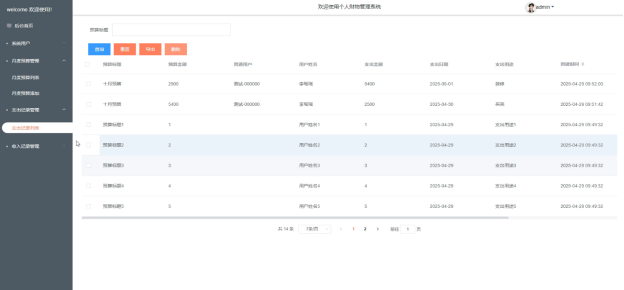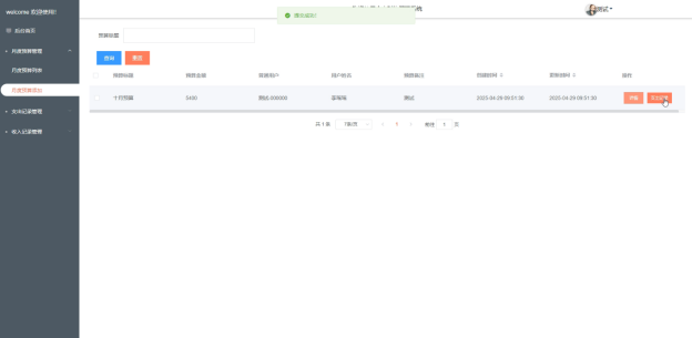 - 月度预算管理:在这个模块中,管理员可以添加新的预算计划,也可以对已有的预算计划进行删除或查询操作。点击预算计划,可以查看该计划的详细内容,包括预算的分类和金额。管理员还可以查看当月的支出记录,以及将预算数据导出为报表,方便进行财务分析和审计。
