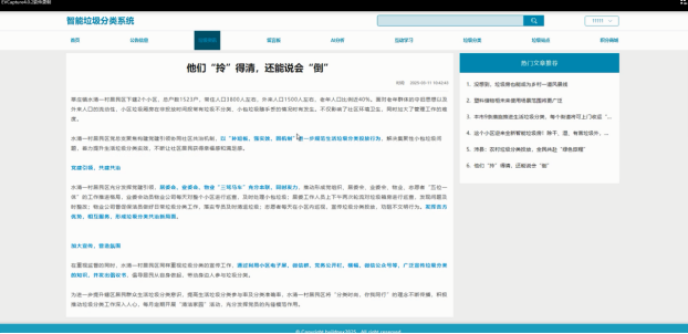 - 垃圾资讯:垃圾资讯板块则提供了新闻热门文章,用户可以阅读、点赞、收藏和评论,参与垃圾分类的讨论和交流。