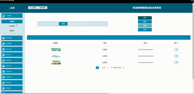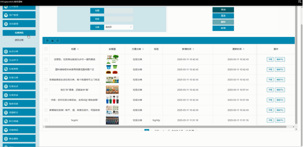 - 资讯管理:集中管理垃圾资讯及资讯分类,确保用户获取到的信息及时、准确。管理员可轻松添加、编辑、删除资讯内容,调整资讯分类,满足不同用户的需求。同时,提供便捷的查询、重置功能,方便管理员进行日常维护。