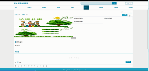 - 互动学习:搭建学习平台,管理员可上传学习名称、类型等相关资料,鼓励用户参与垃圾分类知识学习。支持查询、重置、删除、新增学习资料,以及详情查看和查看评论功能,促进用户间的交流与分享。