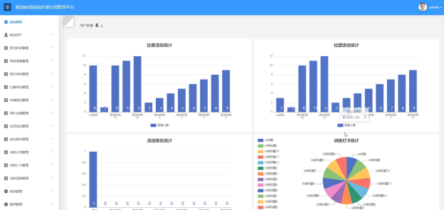 - 后台首页:提供一个功能导航栏,方便管理员快速访问各个模块。同时,后台首页还展示了比赛活动统计图、社团活动统计图、活动报名统计图、训练打卡统计图以及训练信息统计图,帮助管理员一目了然地掌握各项活动的最新动态。此外,管理员可以通过点击头像来查看或修改个人信息和密码,确保个人信息的安全和隐私。