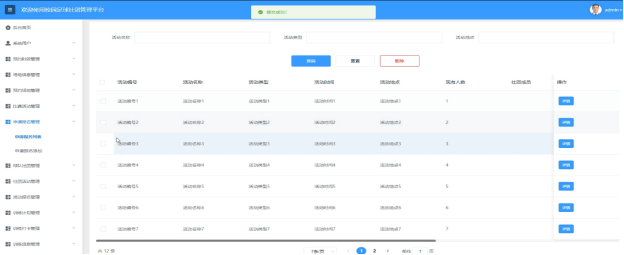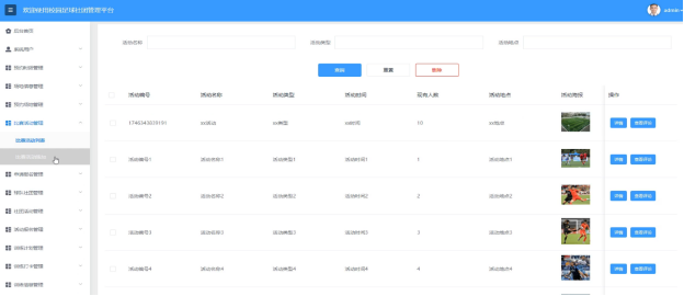 - 活动报名管理:管理员可以查询和删除已经报名的活动信息,并查看每个报名的详细情况。