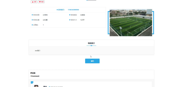 - 场地信息:用户可以浏览可用的足球场地信息,对感兴趣的场地进行点赞、收藏和评论,并进行预约操作,方便安排比赛和训练。