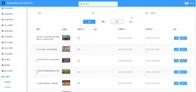 - 资源管理:管理员可以管理足球资讯,包括资讯分类的添加、查询、删除和查看评论,为用户提供丰富的足球相关资讯。