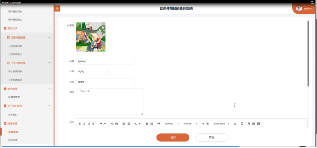 资源管理:资源管理功能为用户提供了一个全面的养老资讯平台。在这里,用户可以轻松获取到各类养老资讯,为了方便用户更好地管理和浏览这些资讯,系统对资讯进行了科学的分类。用户不仅可以快速查询到自己感兴趣的资讯,还可以对资讯进行重置、删除、添加等操作,以满足个性化需求。