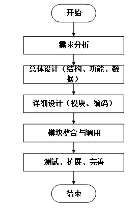 系统开发流程的主要步骤,从需求分析到系统完成的全过程。流程包括需求分析、总体设计(结构、功能、数据)、详细设计(模块、编码)、模块整合与调用,以及测试、扩展和完善,最终完成系统的开发。本系统的开发流程如下图所示