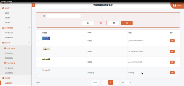 系统管理:轮播图作为系统界面中的重要展示部分,其内容的更新与维护至关重要。管理员可以通过系统管理模块,轻松地对轮播图进行重置、删除、添加、详情等功能操作,帮助管理员全面掌控轮播图的使用情况。