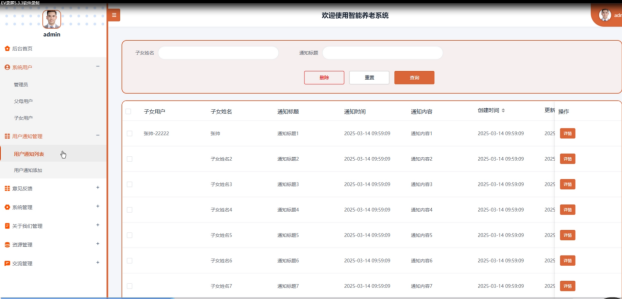 用户通知管理:管理员可以轻松地对所有用户通知进行查询、重置、删除、添加、详情等功能进行操作,确保信息的准确性。每个通知的详情页提供了通知的详细内容、发布时间以及接收用户等关键信息,便于管理员随时掌握通知的发送情况。