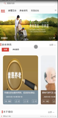 养老资讯:我们提供丰富的养老资讯,涵盖健康、饮食、活动等多方面内容。用户可以对感兴趣的文章进行点赞、收藏和评论,与更多同龄人分享用户的看法和经验。