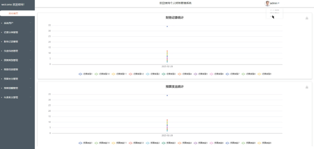 - 后台首页:用户登录后,首先会进入后台首页。在这里,用户可以看到一个简洁明了的界面,展示个人信息、修改密码、财务记录统计图、预算支出统计图以及年度收支统计图等关键信息。这些图表和数据帮助用户快速了解自己的财务状况,便于做出相应的财务决策。