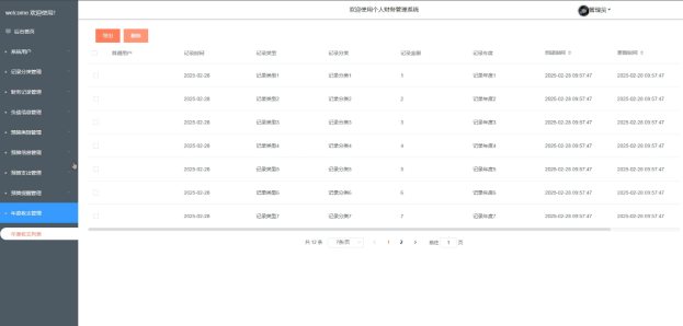 本系统通过实现用户权限管理、财务记录管理、预算管理及年度收支统计等核心模块,为用户提供了全面的财务管理功能[2]。普通用户可以通过简单的操作,轻松实现财务记录的添加、删除与查询,随时查看自己的负债信息、预算支出和提醒,还能方便地导出年度收支数据,为个人的财务规划提供有力支持[3]。而管理员则拥有更高的权限,可以全面管理系统用户、记录分类、预算类别等内容,确保系统的正常运行和数据的安全性。