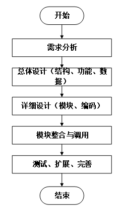 系统开发流程的主要步骤,从需求分析到系统完成的全过程。流程包括需求分析、总体设计(结构、功能、数据)、详细设计(模块、编码)、模块整合与调用,以及测试、扩展和完善,最终完成系统的开发。本系统的开发流程如图3-3所示