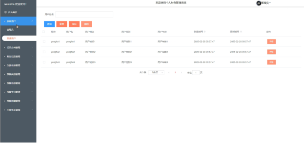 - 系统用户:在系统用户管理模块中,管理员可以查看和管理所有系统用户。系统用户分为两类:管理员和普通用户。管理员可以添加新的用户账号,分配不同的权限,并对现有用户进行删除或修改操作。普通用户则只能查看和使用系统功能,无法进行管理操作。