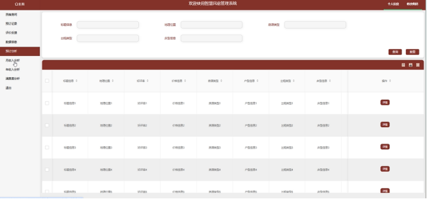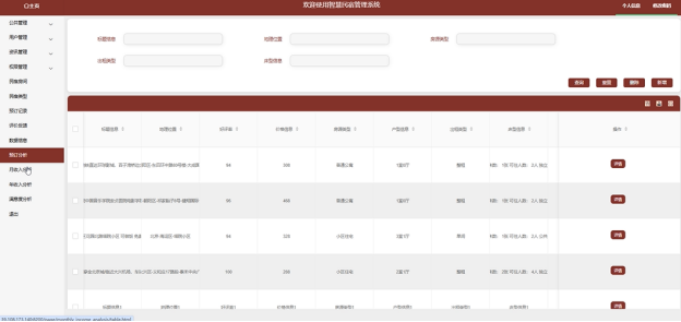 - 预订分析:管理员可以对预订数据进行深入分析,包括查询、重置、删除、新增和查看详情,以优化预订策略。