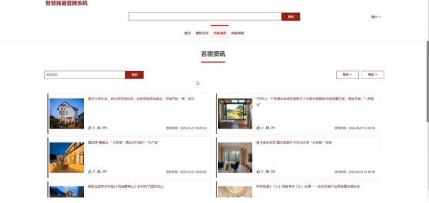 - 名宿资讯:为用户提供了一系列实用的功能,包括搜索、排序、筛选、点赞和评论。用户可以通过这些功能快速找到自己感兴趣的民宿信息,并对心仪的民宿进行点赞和评论,与其他用户分享自己的体验。