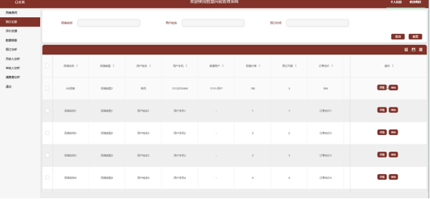 - 预订记录:提供预订记录的查询、重置、查看详情功能,便于跟踪和管理客户预订情况。