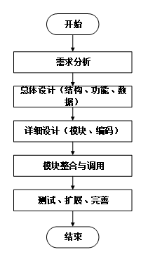 系统开发流程的主要步骤,从需求分析到系统完成的全过程。流程包括需求分析、总体设计(结构、功能、数据)、详细设计(模块、编码)、模块整合与调用,以及测试、扩展和完善,最终完成系统的开发。本系统的开发流程如下图所示