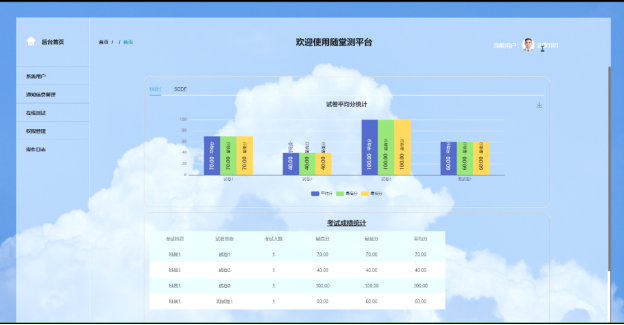 - 后台首页:在后台首页,教师用户可以看到试卷平均分统计、考试成绩统计以及当前登录用户的信息。这些功能可以帮助教师快速了解学生的学习情况和平台的使用情况。