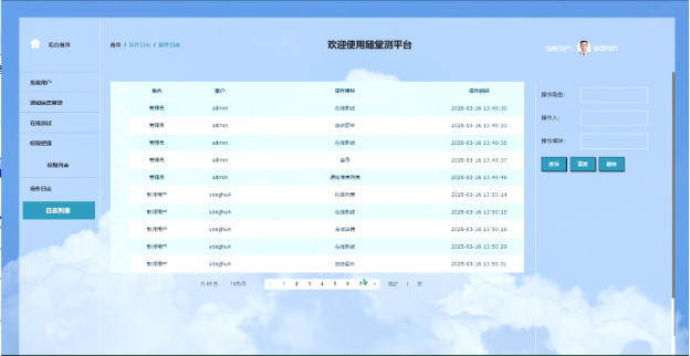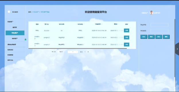 - 系统用户:在系统用户管理页面,教师可以对学生用户进行管理,包括查询、重置密码、删除用户以及查看用户详情等功能。这些操作有助于教师维护学生账户的正常运行和安全。