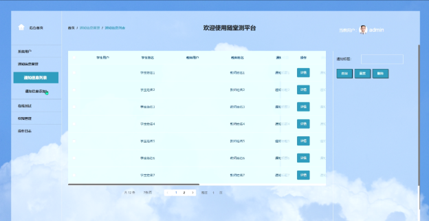 - 通知信息管理:教师可以在这里管理通知信息,包括查看通知信息列表、进行查询、重置信息以及查看详情。这些功能确保教师可以有效地向学生传达重要信息。