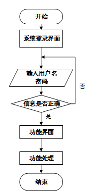 用户首先进入系统登录界面,输入用户名和密码后,系统验证信息是否正确。若验证失败,返回登录界面重新输入,若验证成功,则进入功能界面,执行相应功能处理后结束操作流程。操作流程如下图所示。