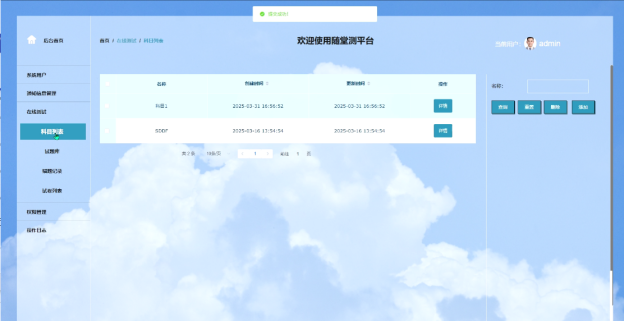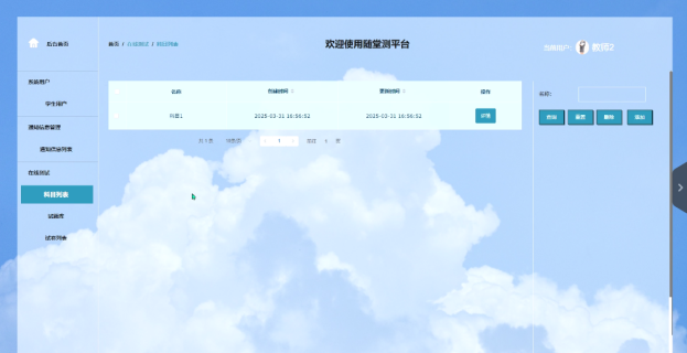 - 在线测试:在线测试管理页面,教师可以进行一系列操作,包括管理科目列表、查询、重置、删除和添加科目。还可以管理试题库,进行查询、重置、删除、添加、导出和导入试题,下载导入文档,并查看试题详情。试卷列表管理功能允许教师查询、重置、删除、添加和查看试卷详情。题库管理功能包括生成试卷和评分,这些功能为教师提供了全面的在线测试管理工具。