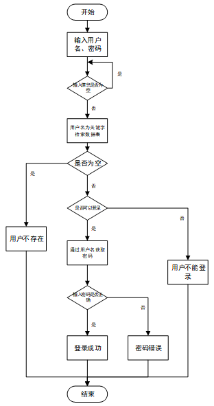 用户输入用户名和密码后,系统先检查输入是否为空,再验证用户名是否存在,若存在则通过用户名获取密码并校验。若密码正确则登录成功,否则提示密码错误。若用户名不存在或无法登录,提示用户操作无效。如下图所示。