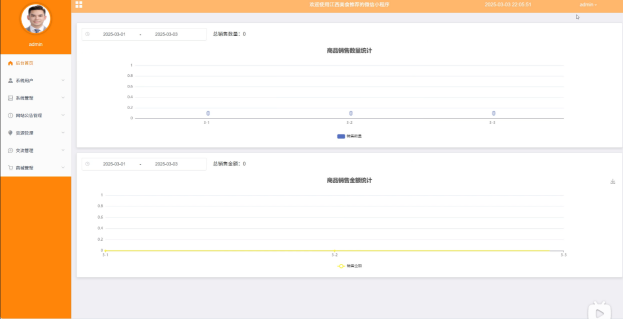 - 后台首页:后台首页是管理员进入系统后看到的第一个界面,它提供了一个直观的仪表盘,显示了关键的业务数据,如商品销售数量统计和商品销售金额统计。这些统计信息帮助管理员快速了解商城的运营状况,从而做出相应的管理决策。