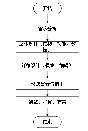 系统开发流程的主要步骤,从需求分析到系统完成的全过程。流程包括需求分析、总体设计(结构、功能、数据)、详细设计(模块、编码)、模块整合与调用,以及测试、扩展和完善,最终完成系统的开发。本系统的开发流程如下图所示