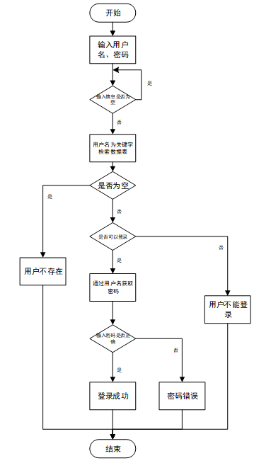 用户输入用户名和密码后,系统先检查输入是否为空,再验证用户名是否存在,若存在则通过用户名获取密码并校验。若密码正确则登录成功,否则提示密码错误。若用户名不存在或无法登录,提示用户操作无效。如下图所示。
