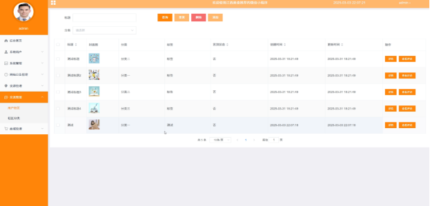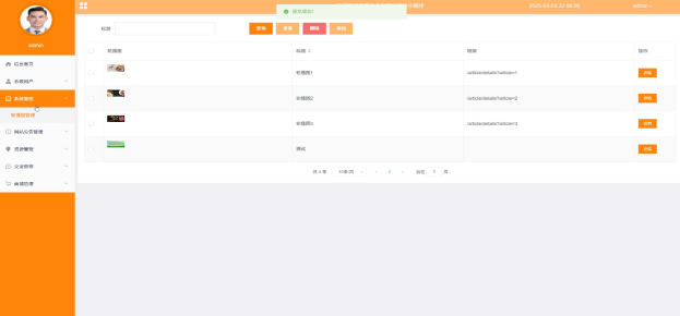- 系统管理:系统管理模块提供了对网站前台展示内容的控制,包括轮播图的添加、删除和查询功能。管理员可以上传新的轮播图,设置其展示顺序和时间,也可以移除不再需要的轮播图,确保网站的展示内容始终是最新的和最吸引人的。