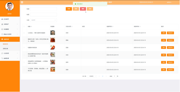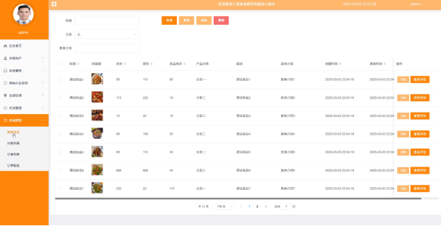 - 商城管理:商城管理模块是整个后端系统的核心部分,它包括美食信息的管理、分类列表的维护、订单列表的查看以及订单配送状态的更新。管理员可以添加新的商品信息,编辑或删除现有商品,管理商品分类,查看和处理订单,以及更新订单的配送状态,确保商城的顺畅运营。