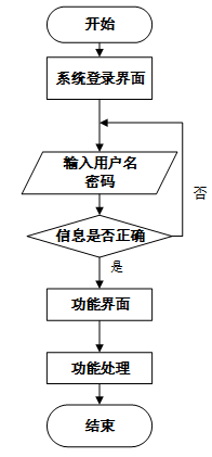 用户首先进入系统登录界面,输入用户名和密码后,系统验证信息是否正确。若验证失败,返回登录界面重新输入,若验证成功,则进入功能界面,执行相应功能处理后结束操作流程。操作流程如下图所示。