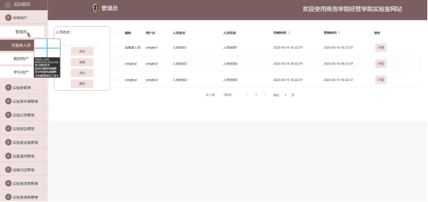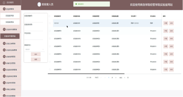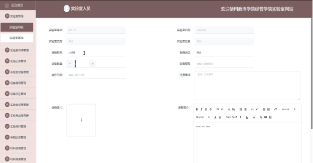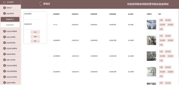 - 实验室管理:实验室人员可以在此模块添加新的实验室信息,查询现有实验室的详细资料,以及管理实验室内的设备和科研成果。
