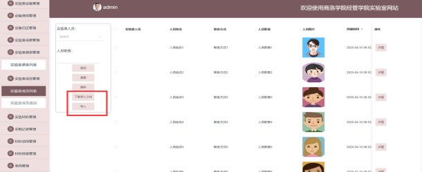 - 实验室成员管理:管理员可以对实验室成员进行添加、删除和查询操作,查看成员的详细信息。管理员还可以导入新的成员数据,以及下载成员导入文档,方便成员信息的更新和维护。