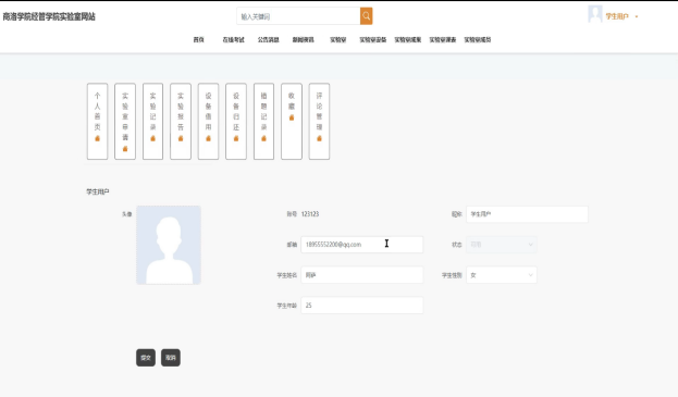 - 个人中心:个人首页提供学生个人的基本信息展示,实验室申请模块允许学生跨表添加实验记录和报告,实验记录和实验报告模块方便学生记录和查看自己的实验过程和结果,设备借用和归还模块让学生管理自己的借用记录,错题记录帮助学生回顾和复习,收藏和评论管理则让学生管理自己在平台上的收藏和评论内容。