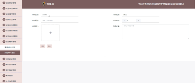 - 实验材料管理:管理员可以对实验材料进行添加、删除和查询操作,查看材料的详细信息。管理员还可以进行采购入库操作,记录材料的领用情况,以及处理材料的报废记录。当材料库存低于预警值时,系统会弹出提醒窗口,帮助管理员及时补充库存。
